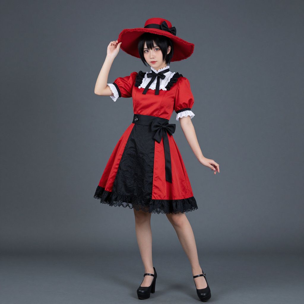 Photograph of a young woman in a cosplay outfit against a plain gray background. She wears a vibrant red dress with black accents, including a black ribbon at the waist and black lace trim at the hem. The dress has short puffed sleeves with white lace cuffs. She has black hair, partially covered by a large red hat with a black ribbon. She is also wearing black Mary Jane shoes. Her right hand touches the brim of her hat, and her left arm hangs relaxed. Her skin is light, and she has a slight smile. The overall style is reminiscent of vintage or gothic fashion.