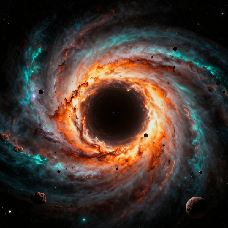 This digital artwork depicts a vividly colorful, swirling black hole at the center of a cosmic galaxy. The black hole is surrounded by a bright, fiery orange and red ring, with blue and white nebulous clouds extending outward, creating a dynamic spiral effect. Small, dark asteroids or planets are scattered throughout the swirling vortex, adding to the sense of depth and motion. The background is a dark, star-filled space, enhancing the contrast and intensity of the swirling colors and energy around the black hole. The image combines realistic and fantastical elements to create a dramatic, otherworldly scene.