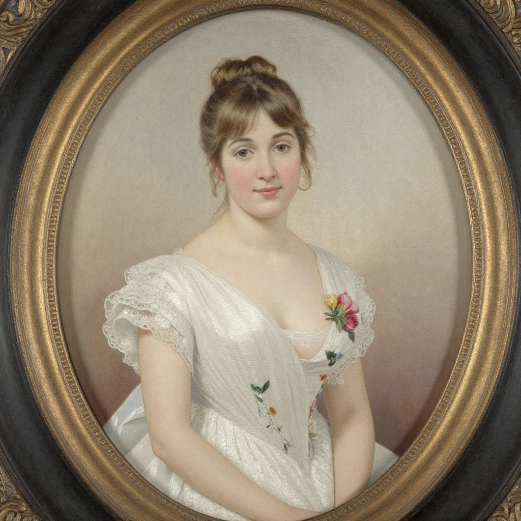 This is a digital reproduction of a classical oil painting in an oval frame with an ornate gold border. The portrait features a young Caucasian woman with fair skin and brown hair styled in an updo with loose curls. She has a round face, rosy cheeks, and a gentle smile. She wears a white, lace-trimmed dress with floral embroidery on the bodice, including a pink rose. The background is a simple, muted gradient from light to dark beige. The woman's gaze is directed slightly to the right, and her right hand rests gently on her dress. The overall style is reminiscent of 19th-century portraiture.