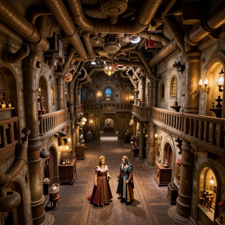 A huge ship-castle, where my sister and I are rulers in another fantasy world like Narnia, Figures made of pipes, lots of rooms and long corridors, Strange arrangement of interior items on the ceiling, on the walls