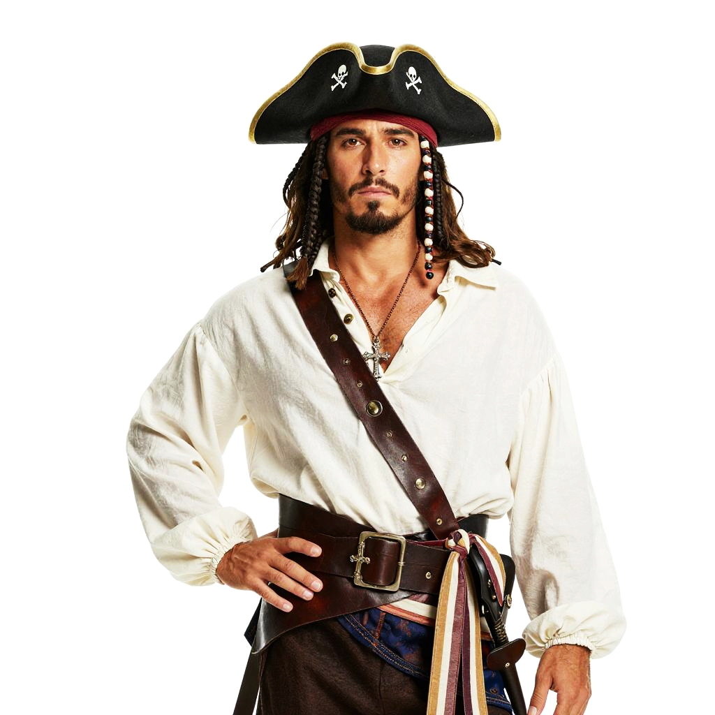 A man dressed in a detailed pirate costume stands confidently against a plain white background. He wears a black tricorn hat with skull and crossbones symbols, a white shirt with rolled-up sleeves, and leather belts across his chest and waist, complemented by his braided hair and a cross pendant necklace.