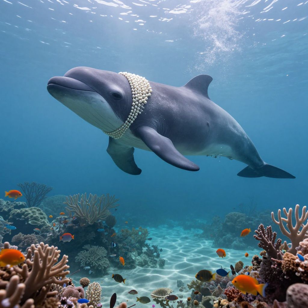 Photograph of a gray dolphin wearing a pearl necklace, swimming above a vibrant coral reef with orange fish and sunlight filtering through clear blue water.