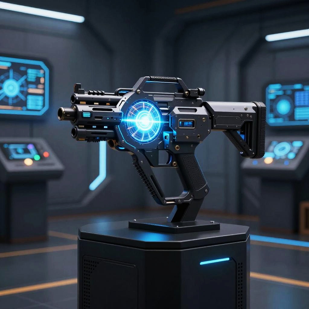 A futuristic machine gun displayed on a sleek black pedestal, glowing pulse energy core, in a high-tech armory with holographic control panels, sharp details, ambient blue lighting
