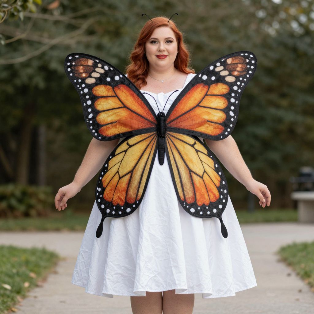 Plus Size Monarch Butterfly Costume, woman in a white dress with a butterfly costume on