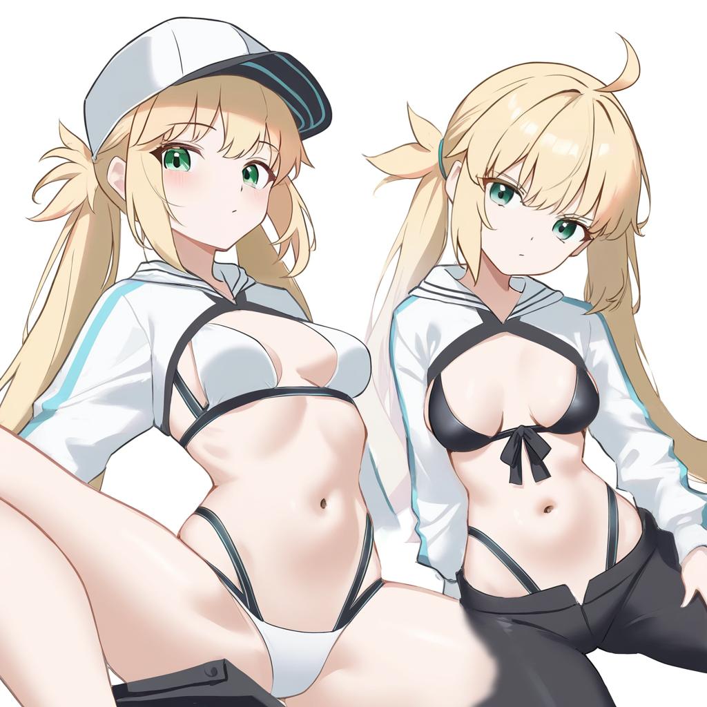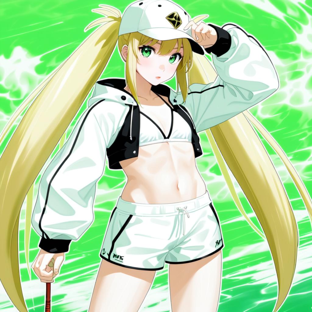 Artoria caster (swimsuit) (first ascension) (fate), fate (series), 1girl, green eyes, blonde hair, long hair, twintails, medium breasts, small breasts, thighs, navel, white bikini, baseball cap, white jacket, shrug (clothing), white headwear, cropped jacket, black pants, long sleeves, single pantsleg, white hat, by artist ormille, animagine