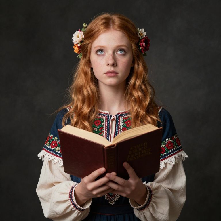 Photograph of a fair-skinned, red-haired girl with floral headpiece, wearing traditional embroidered dress, holding open book against dark background.