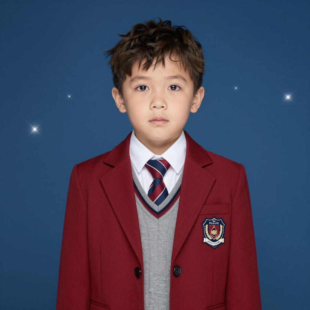 Young boy with brown hair wearing a red blazer, grey vest, and striped tie, standing against a dark blue background with bright white sparkles. Blazer has a school crest. Boy's face is neutral, looking slightly upward. Sparkles are scattered across the background.