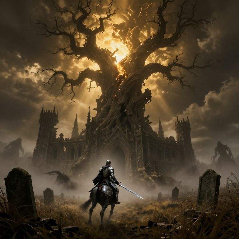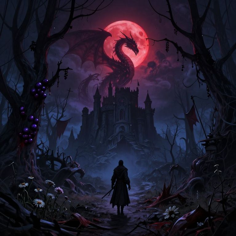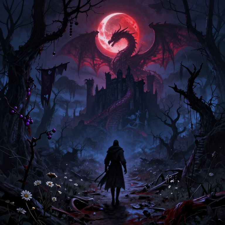 \"Dark fantasy digital illustration: A lone warrior trudges along a decaying path through a twisted forest, Above, a blood-red crescent moon births a spectral dragon made of tattered moonlight and shadow, its ethereal form coiling around a crumbling fortress perched on death-black cliffs, Toxic purple berries gleam on dying trees while withered daisies cling to rotting underbrush, Phantom creatures circle the night sky as tattered flags hang limp from decrepit towers, The scene drowns in midnight blues, corrupted purples, and crimson-stained blacks, radiating an atmosphere of profound despair and lost hope