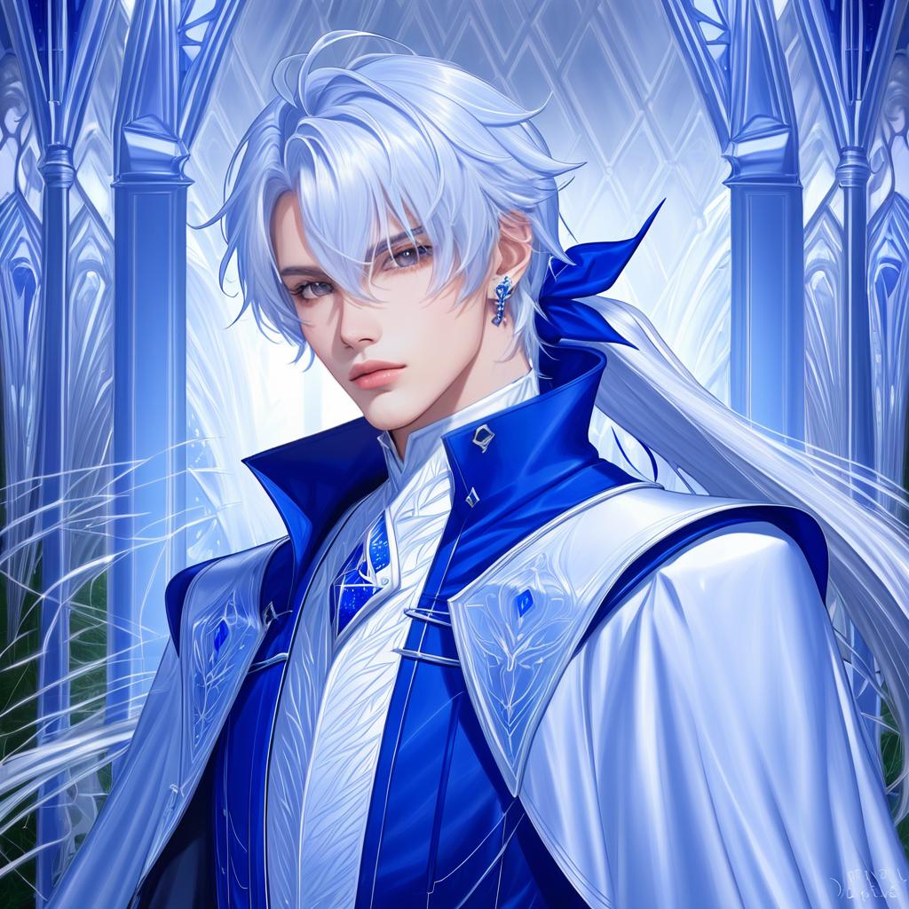 Digital anime-style portrait of a young male character with white and grey long hair tied in a ponytail with a blue ribbon. He has blue eyes and wears a detailed blue and white coat with intricate patterns, white gloves, and a distinctive earring. The background features tall, elegant pillars with an ethereal blue glow, suggesting a fantasy setting.