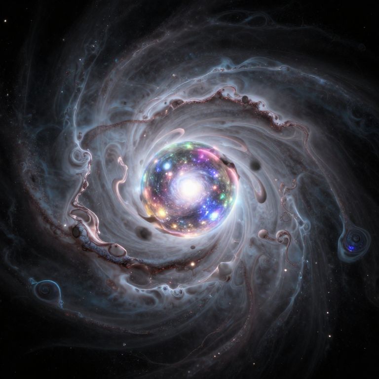 A surreal, liquid-like nebula with swirling patterns and a glowing, cosmic orb at its center.