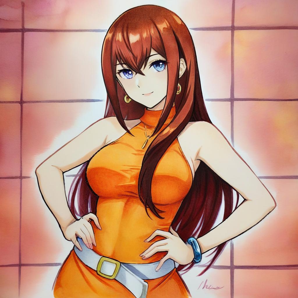 Illustration of an anime-style girl with long brown hair and large amber eyes wearing an orange sleeveless halterneck dress with a brown belt. She has her hands on her hips and wears matching earrings and bracelets. The background features tiled walls, and the artwork is created in traditional media with a visible artist's signature.