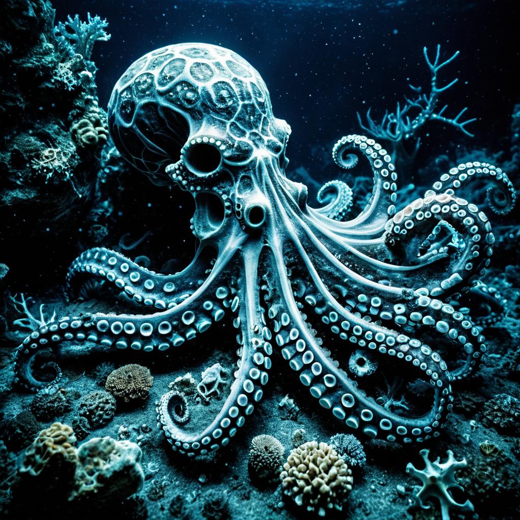 X-Ray artwork of an octopus wrapping tentacles around a shipwreck, bones and coral fragments glowing softly, detailed vein-like patterns, high contrast with glowing highlights and delicate textures