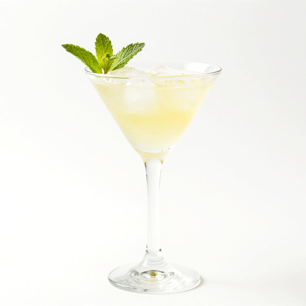 A photograph of a classic martini glass filled with a pale yellow, icy drink. The glass has a slender stem and a wide, shallow bowl. Two small, vibrant green mint leaves are perched on the rim. The background is a solid white, making the drink and glass stand out sharply. The overall look is fresh and refreshing.