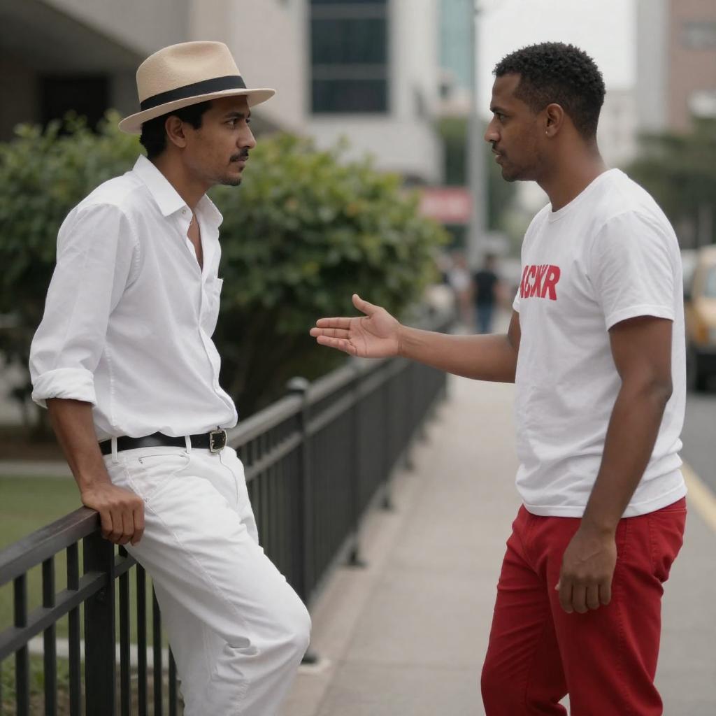 Photograph of two men interacting on a city street. The man on the left, wearing a white shirt, white pants, and a beige hat, leans against a black iron railing. The man on the right, in a white t-shirt with red lettering and red pants, extends his hand towards the other man. Green bush in the background, blurred cityscape in the background. Both men have intense expressions.