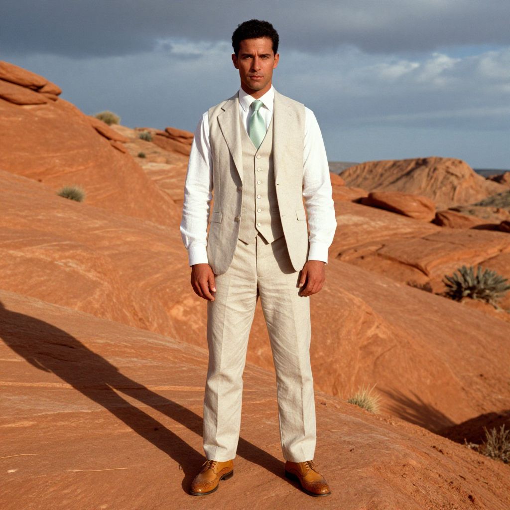 A man, tailored white linen suit, crisp white dress shirt, classic black bow tie, polished black leather oxford shoes, slim-fit silhouette, vibrant shipping containers, glistening water, distant city skyline, ib technicolor film stock, confident expression. Man has masculine face and piercing eyes