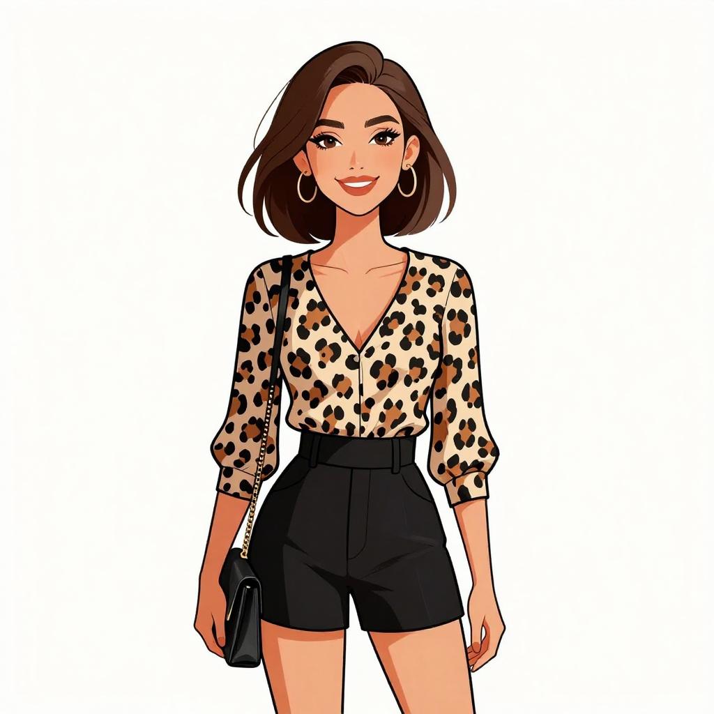 Illustration of a smiling woman with medium-length brown hair wearing a casual chic outfit. She has on a leopard print blouse with a V-neck and three-quarter sleeves, paired with high-waisted black shorts. She accessorizes with gold hoop earrings and carries a simple black clutch with a chain strap.