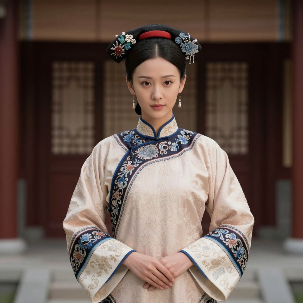 A photograph of an East Asian woman in traditional Chinese attire standing in front of a traditional wooden building. She has fair skin, black hair styled in an updo with floral hairpins, and wears a cream-colored silk robe with intricate blue floral embroidery along the collar, cuffs, and hem. Her hands are gently clasped in front of her. She has a calm, composed expression and is wearing small, dangling earrings. The background features a blurred, brown wooden structure with lattice windows. The overall style is traditional and elegant.