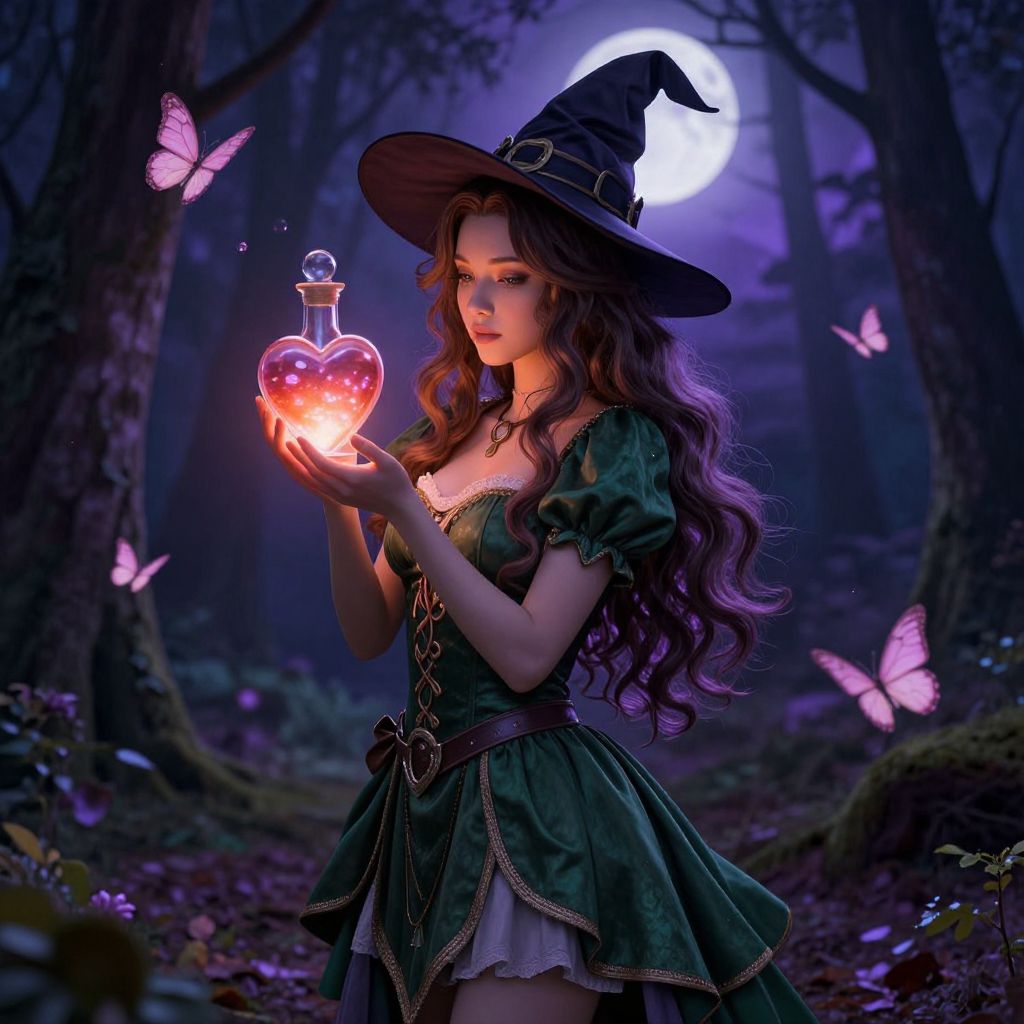In a moonlit forest, a beautiful, curvaceous anime woman dressed as a Valentine's Day witch stands gracefully, her long, wavy hair cascading down her shoulders. She holds a glowing, heart-shaped potion bottle in her hands, the light within casting a warm, orange glow that contrasts with the cool, purple hues of the night. Surrounding her are delicate butterflies, their wings a soft pink, flitting around her and the forest floor. The woman's attire, a green dress with a low neckline and puffed sleeves, is adorned with intricate details and a belt, adding to her enchanting appearance. The overall composition is harmonious, with the woman and her potion bottle as the focal point, set against the dark, leaf-strewn forest floor and the soft, diffused light of the moon. The scene is hyper-detailed, with realistic reflections and textures, creating a sense of depth and realism. The use of color and light enhances the magical, whimsical atmosphere, making it a captivating visual experience.