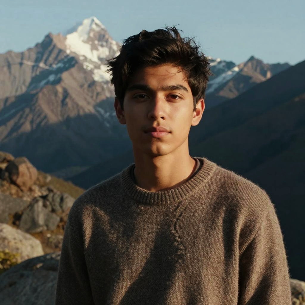 Close-up portrait of a young Asian man with short black hair wearing a grey t-shirt. The image features dramatic sunset lighting with warm tones and strong shadows cast on a plain background. The lighting highlights the intricate facial details and creates a high dynamic range effect.