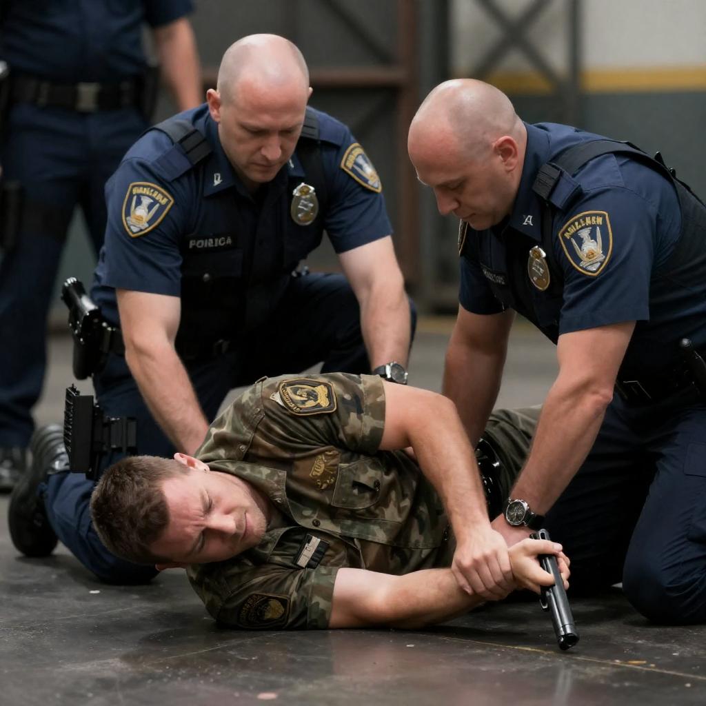 Photograph of a scene with three police officers and one man. The man, with short brown hair, camouflage shirt, and intense expression, lies on the floor, gripping a gun in his right hand. Two bald officers in blue uniforms, one with a badge, pin him down. The third officer, partially visible, stands behind. Industrial background with metal structures and dim lighting.