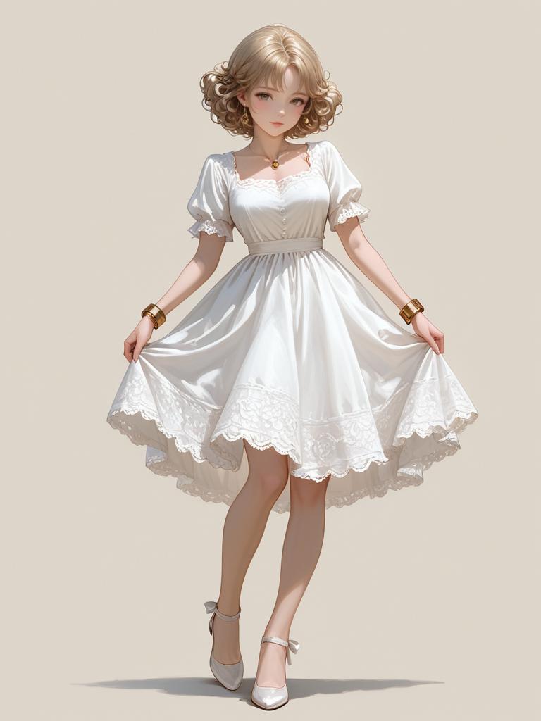 1girl, realistic face, full body shot, Woman, romantic style, white lace dress, short sleeves, round neckline, knee-length with a flounce hem, delicate golden bracelet, natural makeup, softly curled hair, white studio background