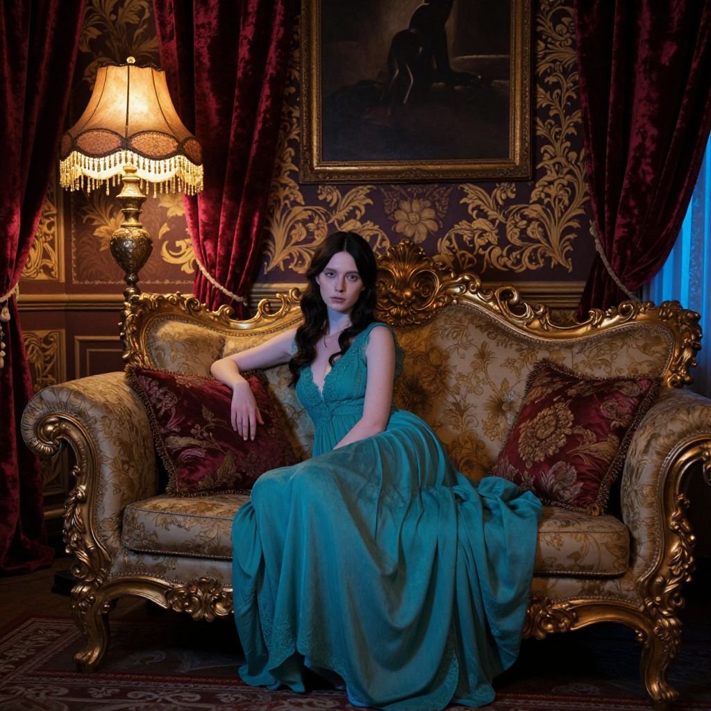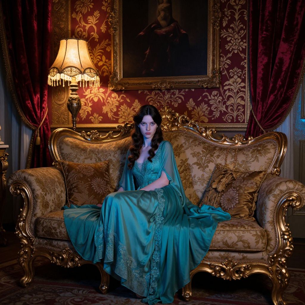 A surreal, luxurious image of a woman sitting elegantly on a lavish, baroque-style couch with ornate golden carvings, She is dressed in a flowing, teal dress with delicate lace details that catch the soft ambient light, Her dark brunette hair is styled in long waves, framing her pale, freckled ethereal face, The room around her is richly decorated, with heavy velvet curtains in a deep crimson hue and walls adorned with intricate, golden floral patterns, A vintage lamp casts a warm glow, contrasting with the cool blue light that illuminates her, The scene has a cinematic, dreamlike quality, with subtle hints of abstraction—the colors appear rich and saturated, giving the room an almost otherworldly atmosphere, In the background, a mysterious, shadowy painting hangs on the wall, adding a sense of intrigue