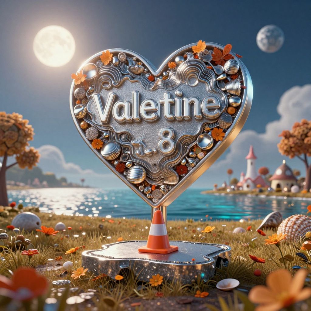 Digital artwork of a shiny, heart-shaped Valentine's Day sign with metallic swirls and leaves, set on an orange cone, in a vibrant, surreal