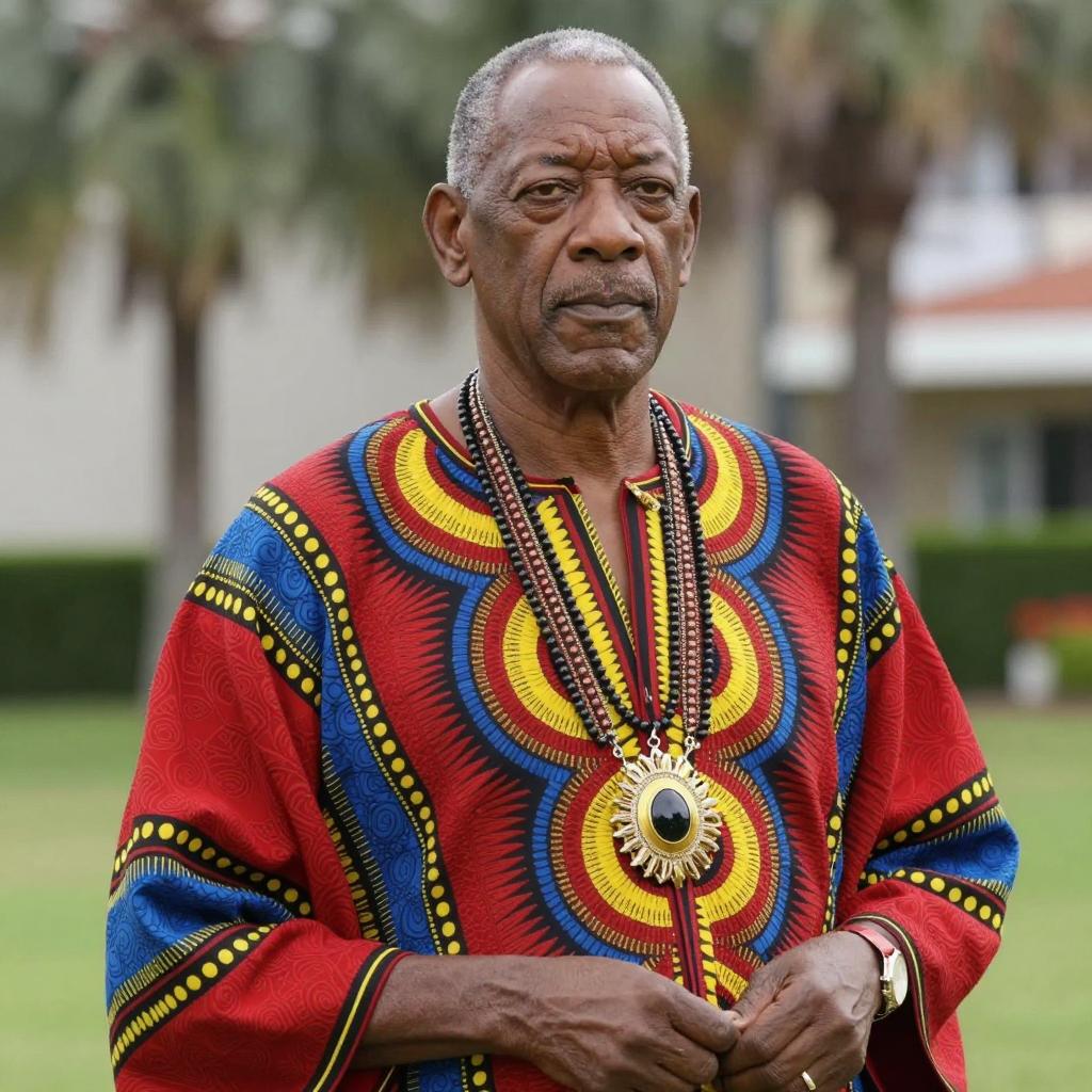 Bill cosby fancy dress, photograph of elderly African man, standing outdoors, wearing colorful sleeveless patterned robe with red, blue, and yellow designs, large ornate necklace, wristwatch, bald with gray hair, serious expression, green grass and palm tree in background, daylight, realistic style, medium close-up, portrait orientation, detailed ures, natural light