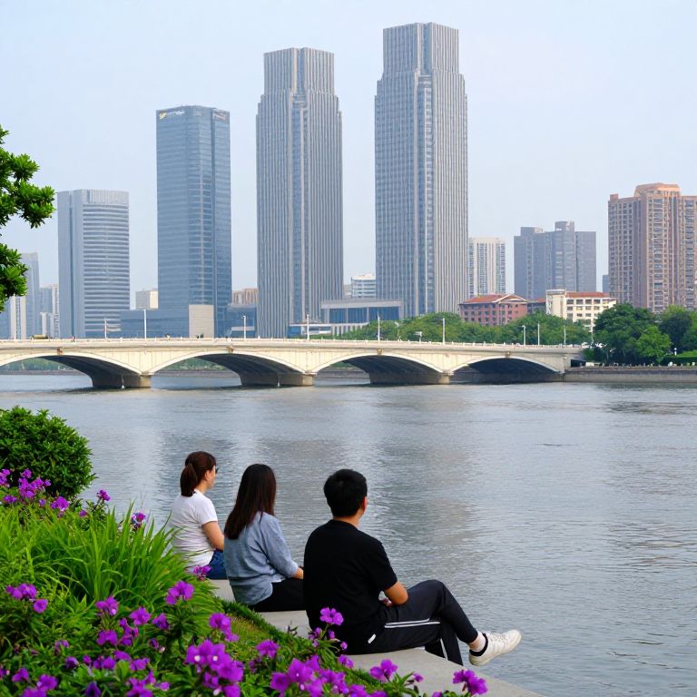 Urban skyline towers above a serene waterfront scene where three individuals relax on a concrete ledge, surrounded by vibrant purple flowers and lush greenery, with a classic bridge spanning the calm river in the background.