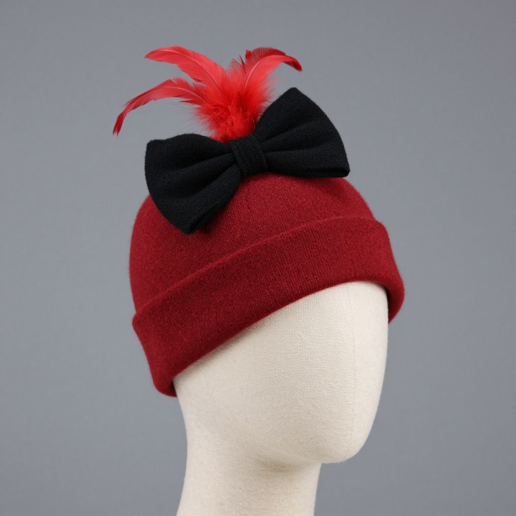 Photograph of a white mannequin head wearing a red knit hat with a black bow and red feather accents, against a plain gray background.