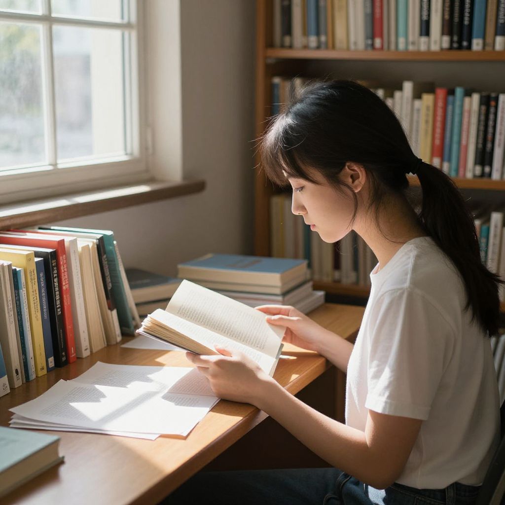 Photograph of an Asian woman with black hair in a ponytail, wearing a white t-shirt, reading a book in a sunlit library, surrounded