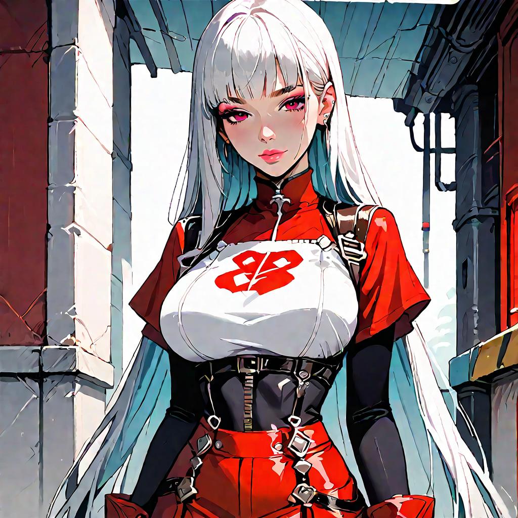Score_9, score_8_up, source_anime, 1girl, blunt bangs, very long hair, black bodysuit, red turtleneck, crop top, red sleeves, red skirt, white gloves, black pantyhose, (large breasts:0.7)