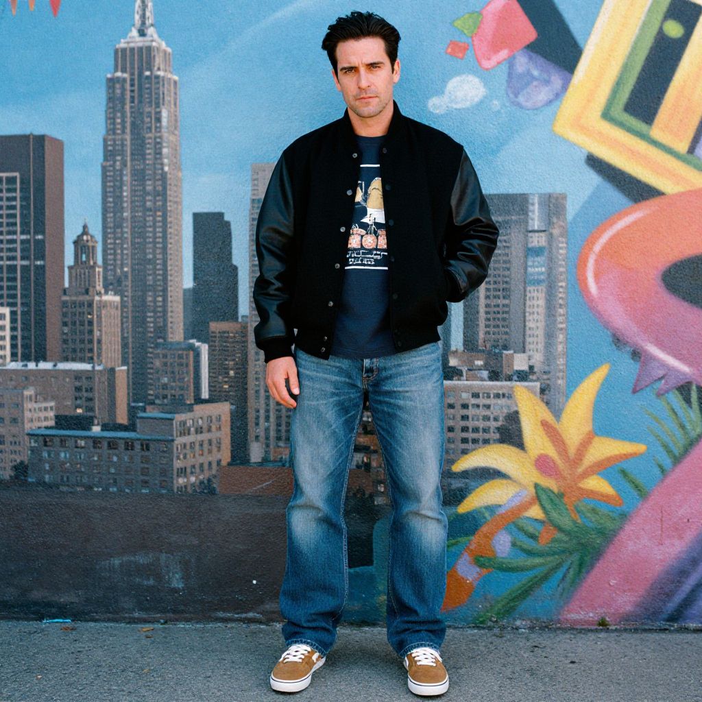 A man, deep burgundy windbreaker, black jersey joggers, stylish slip-on sneakers, classic white button-up shirt, colorful roller coasters, vibrant carnival lights, excited families laughing, technicolor film stock, joyful expression. Man has masculine face and piercing eyes