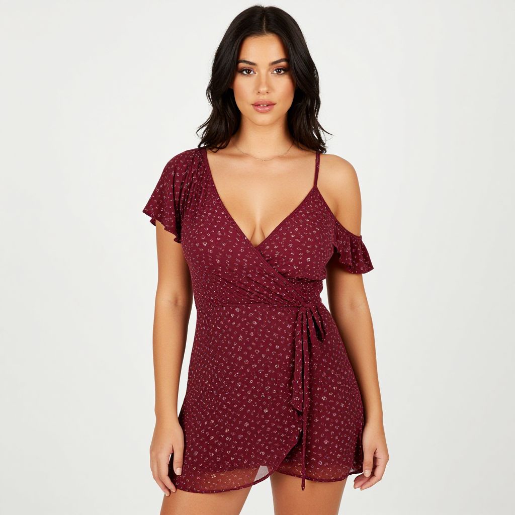 "Woman, casual bohemian, wrap-style mini dress in burgundy with small floral print, short flutter sleeves, one shoulder with adjustable spaghetti strap, v-neckline, tie waist detail, white backdrop.. Sexy. Pretty face and beаutiful eyes. Big breasts."
