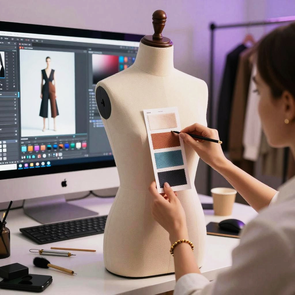 Photo clothing editor in action, showing fabric textures and color swatches being altered on a digital mannequin, surrounded by designer tools, vibrant lighting, futuristic yet realistic style, detailed textures, fashion studio environment