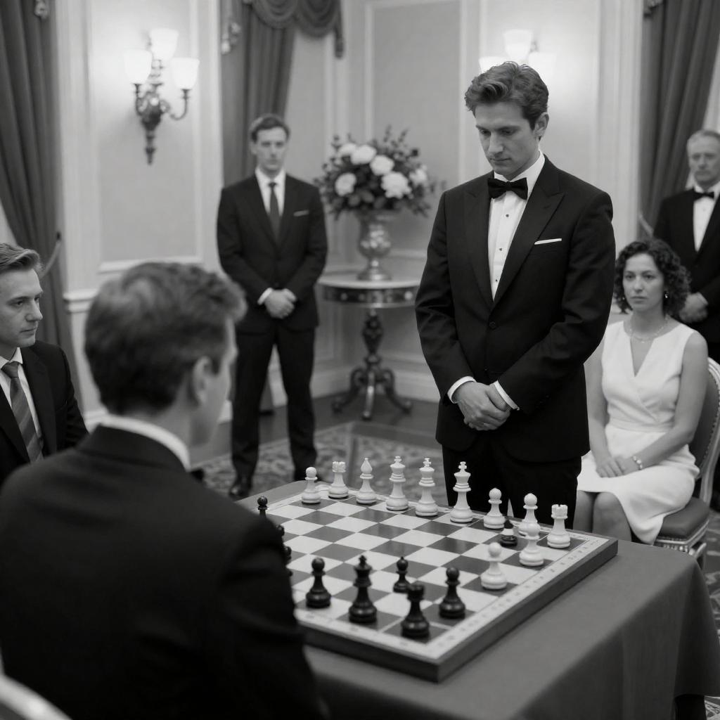 Black-and-white photograph of a formal chess match in an ornate room. Man in dark suit stands near chessboard, facing seated woman in white dress. Several people observe, including another man in suit standing in background. Elegant furniture, floral arrangements, and wall sconces decorate the room. Man with back to camera in foreground. Intense expressions on seated woman and man in dark suit.