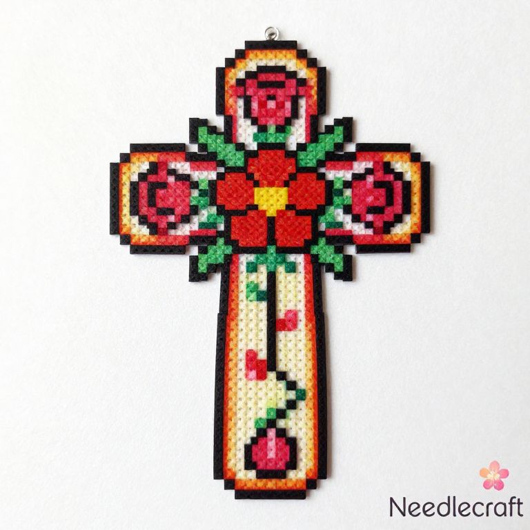 A vibrant cross crafted in pixel art style, featuring intricate rose patterns and a central red flower, designed as part of a plastic canvas kit by Needlecraft Super Shop, showcasing detailed craftsmanship and a retro aesthetic.