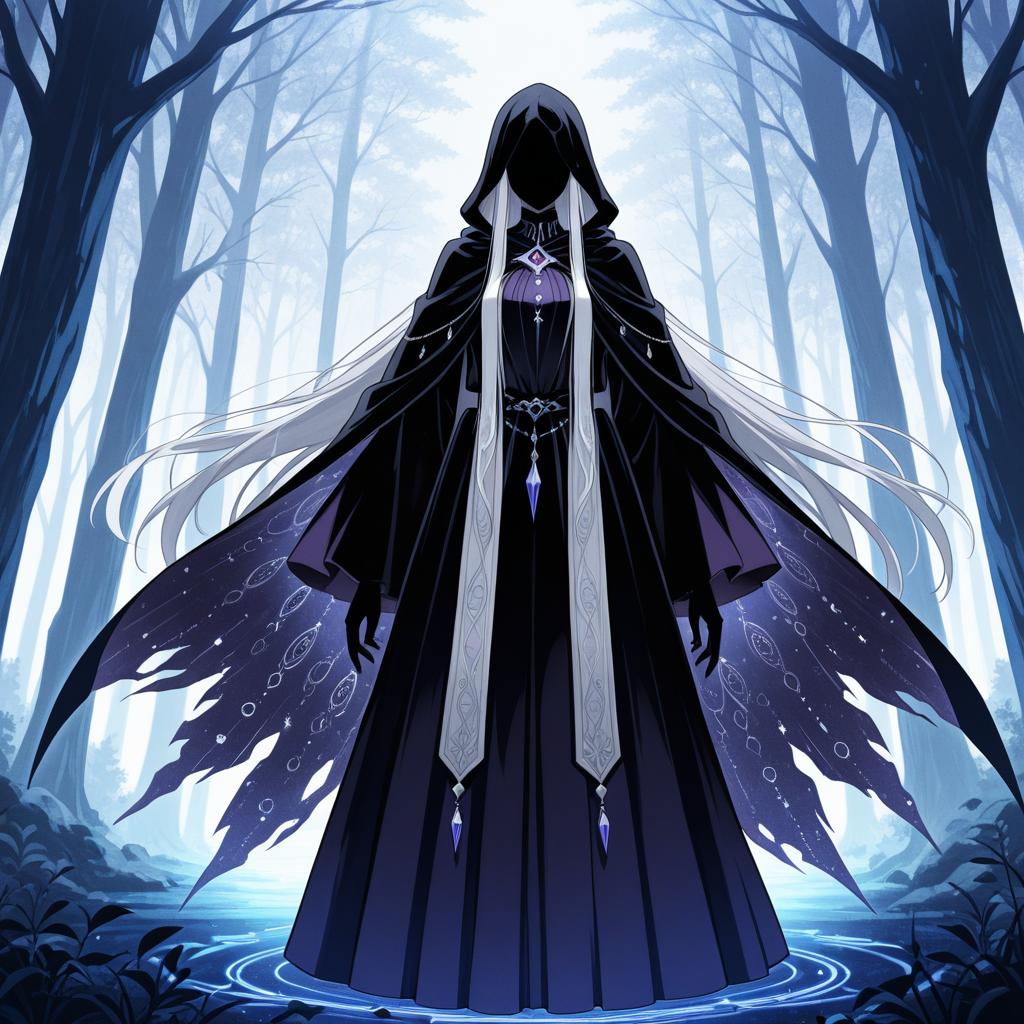 A vibrant anime-style illustration of a mysterious sorceress wearing a flowing dark cloak with silver patterns, set against a mystical moonlit forest with ancient trees.