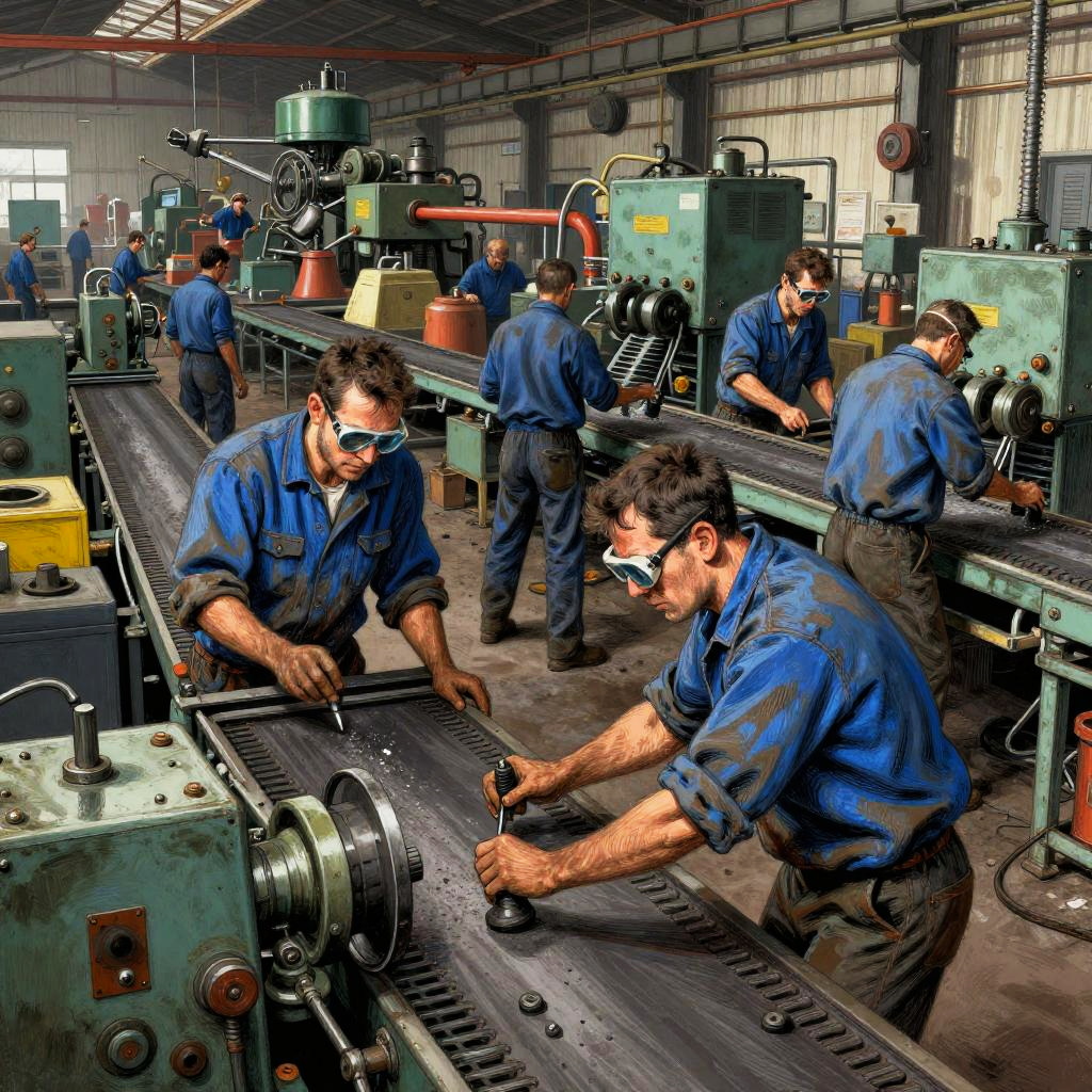 Realistic photo.The prompt is to create an image of factory workers in a blue-collar setting, with a depiction of progress, all in the unique style of the artist Ralph Steadman. The scene is set in a gritty industrial environment, with workers clad in stained uniforms and safety goggles, operating machines amidst a maze of conveyor belts and production lines. In the background of the image, there is a depiction of progress in the form of machinery producing goods at a rapid pace, arranged in a chaotic and haphazard manner. Rendered in the signature style of Ralph Steadman with wild lines, bold colors, and frenetic energy. realistic photo