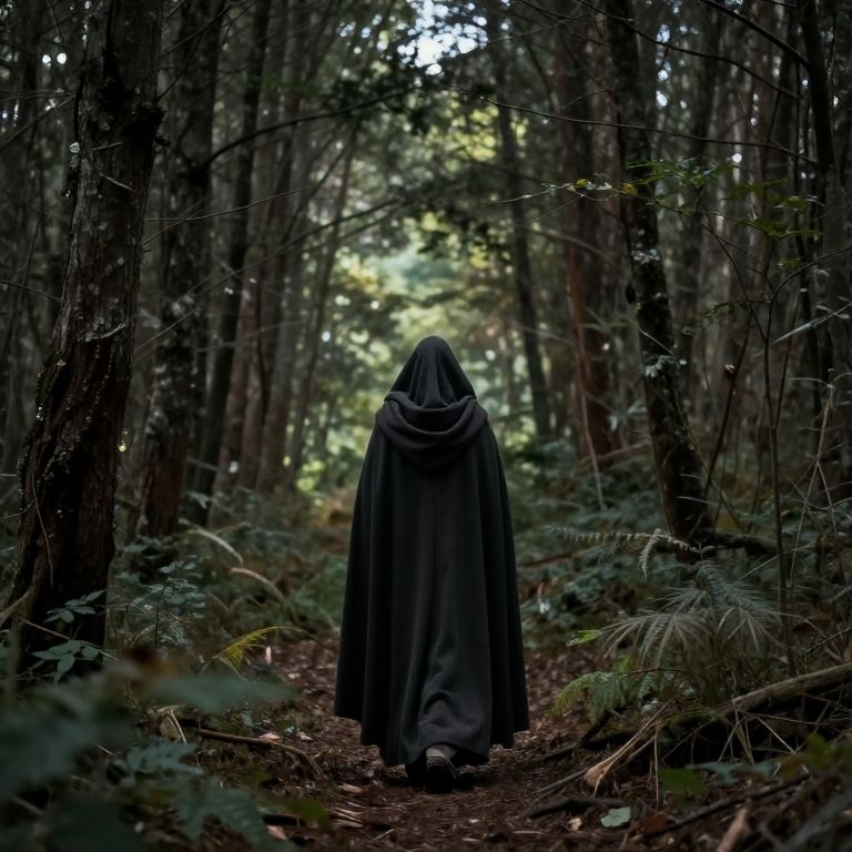 Photograph of a mysterious figure in a black hooded cloak walking down a forest path, surrounded by tall trees and dense underbrush, with dim,