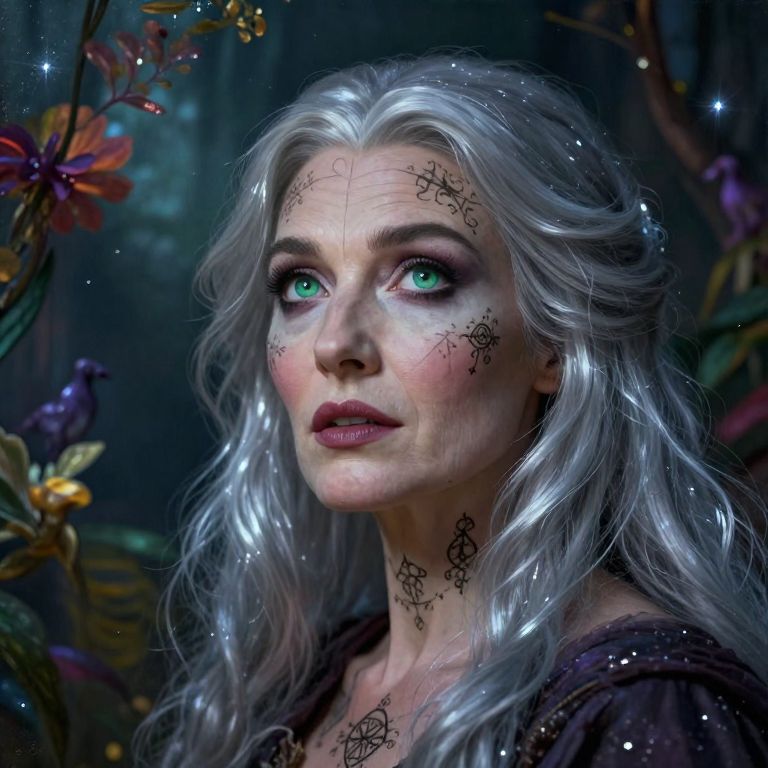 A highly realistic portrait of a fantastical realm's enigmatic witch captivates with her emerald eyes, framed by dark arched brows, and her wise, curious, and mischievous expression. Her smooth skin, adorned with subtle age lines, reflects soft, ethereal light, revealing intricate henna tattoos that hint at ancient spells and forgotten lore. Long, flowing silver hair, streaked with moonlight, frames her face, tilted slightly upward to forge an intimate connection with the viewer. The background seamlessly blends digital art and oil painting, merging vibrant flora and fauna with shimmering stardust to create an atmospheric dreamscape. This dreamscape envelops the observer in a magical and mysterious realm, drawing them into the witch's enchanting world.