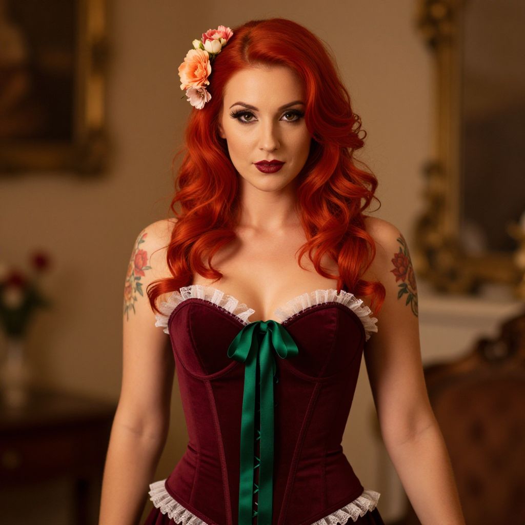 A striking woman with vibrant red hair styled in loose waves poses elegantly in a rich burgundy corset adorned with green ribbon and delicate white ruffles. She has floral tattoos on both shoulders and wears fresh flowers in her hair, set against a softly lit, vintage-inspired interior with warm lighting and blurred background details.