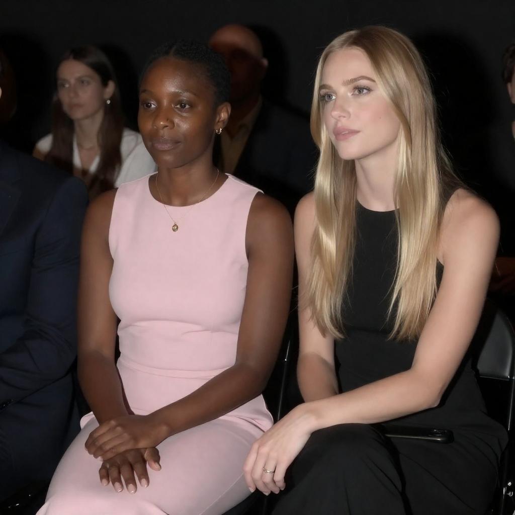 Photograph of two women seated in a dimly lit room. The woman on the left is African-American with short black hair, wearing a pink sleeveless dress and gold necklace. The woman on the right is Caucasian with long blonde hair, wearing a black dress. They sit close together, with the blonde woman's hand resting on the other's arm. Background includes blurred figures and dark shadows.