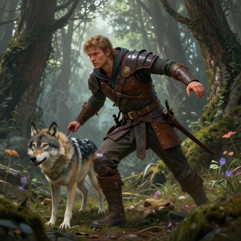 Digital fantasy art: muscular, armored man with blonde hair and sword, crouches beside a wolf in a dense, sunlit forest.