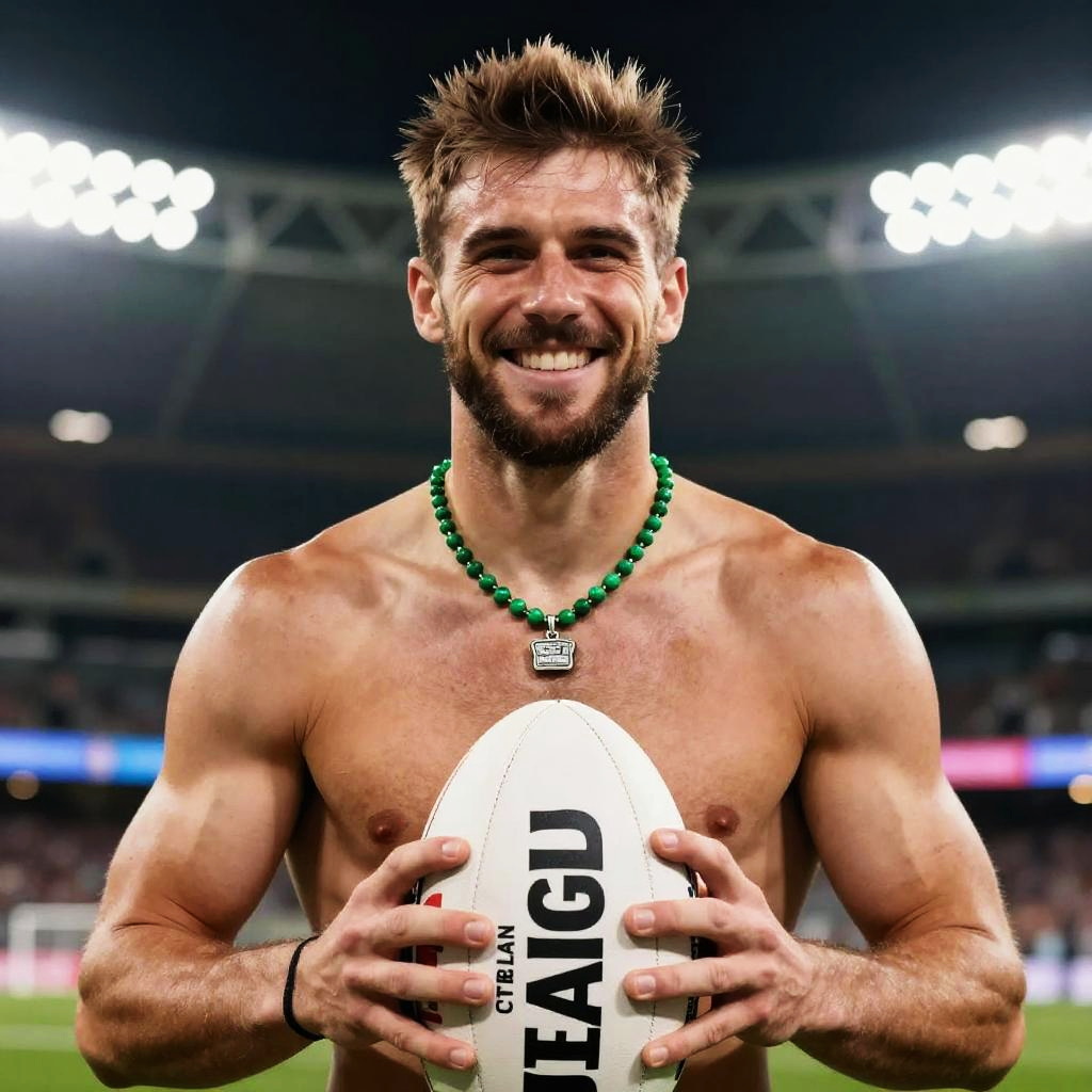 Photograph of a muscular, tan-skinned man with spiky brown hair and a beard, smiling confidently while holding an Australian Rules football. He's shirtless, wearing a green beaded necklace with a pendant, and the stadium lights in the background create a dramatic glow. The man's defined arms and chest are prominently displayed, and the football is centered in his hands.