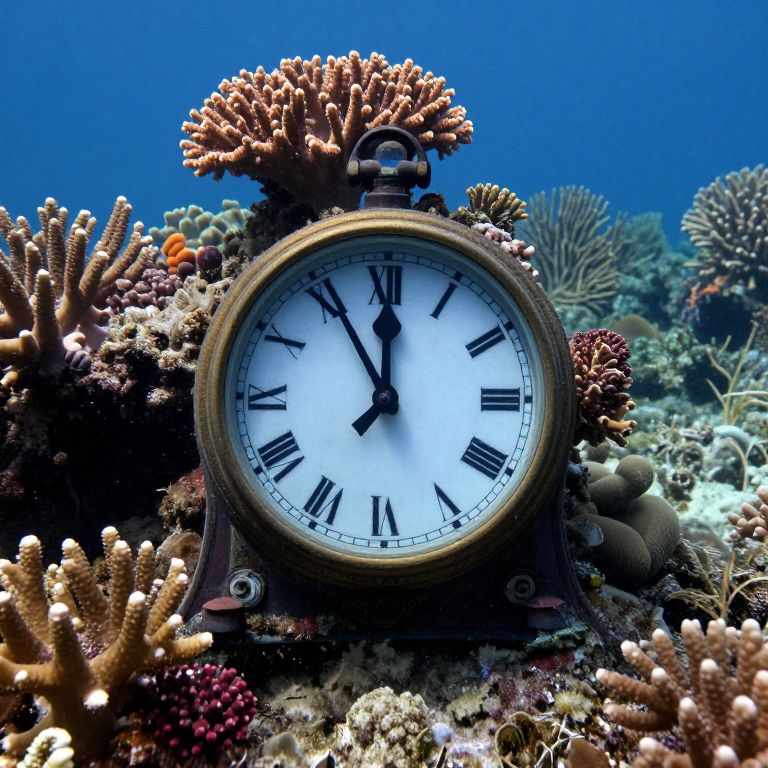 An ancient clock, abandoned in the center of a coral reef, now ticks in reverse underwater, aging marine life into uniform youthfulness.