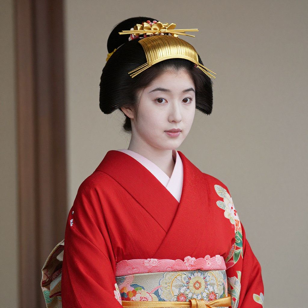 Photograph of a young Japanese woman with fair skin and delicate features, wearing a traditional red kimono adorned with colorful floral patterns on the obi (sash). Her black hair is styled in an elegant updo, secured with a gold hairpiece featuring ornate details. She has a neutral expression, looking slightly to the right. The background is a plain, light-colored wall, providing contrast to her vibrant attire. The kimono's fabric appears smooth and richly textured, while the obi adds a touch of intricate design. The overall composition highlights traditional Japanese cultural attire.