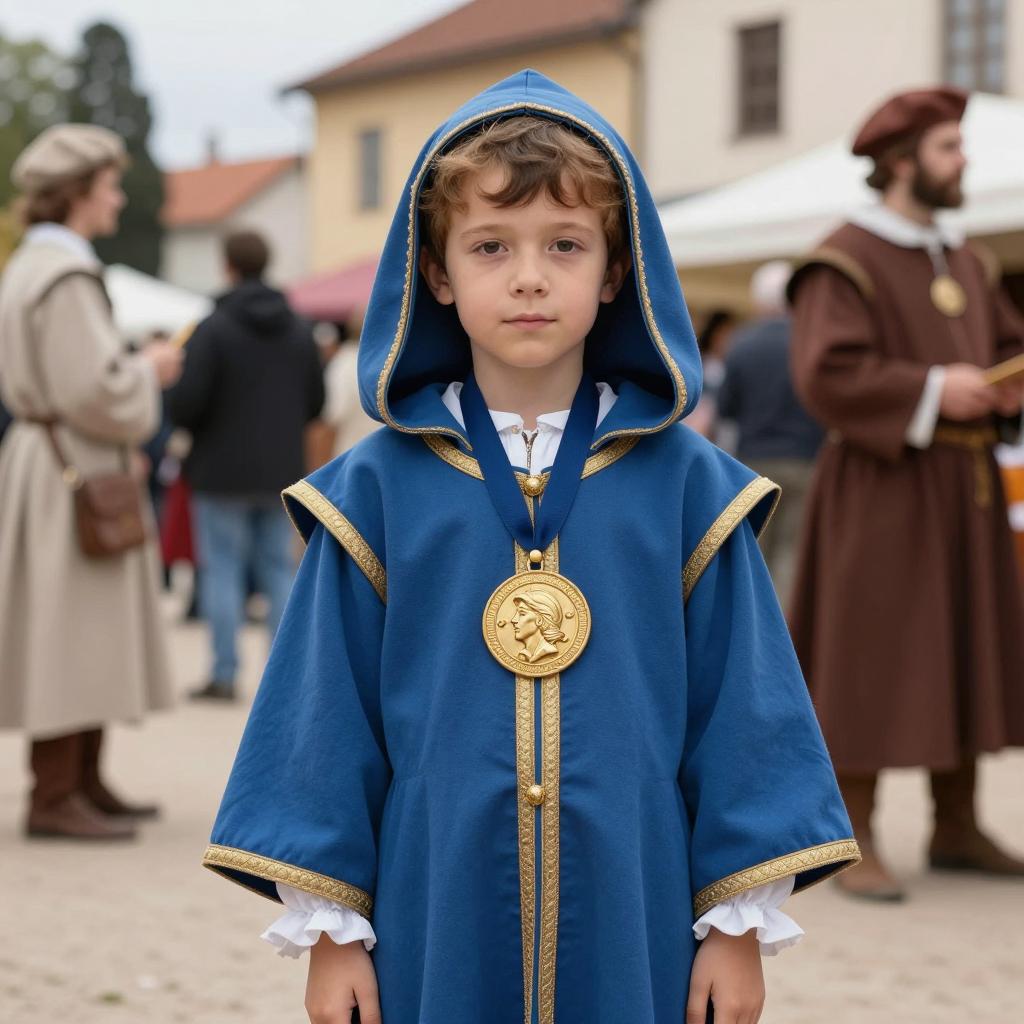 Young child dressed in a traditional Galileo Galilei costume, featuring a royal blue robe with gold trim and a large gold medallion. The child is at an outdoor festival or cosplay event, surrounded by other people in period attire with historical buildings in the background.