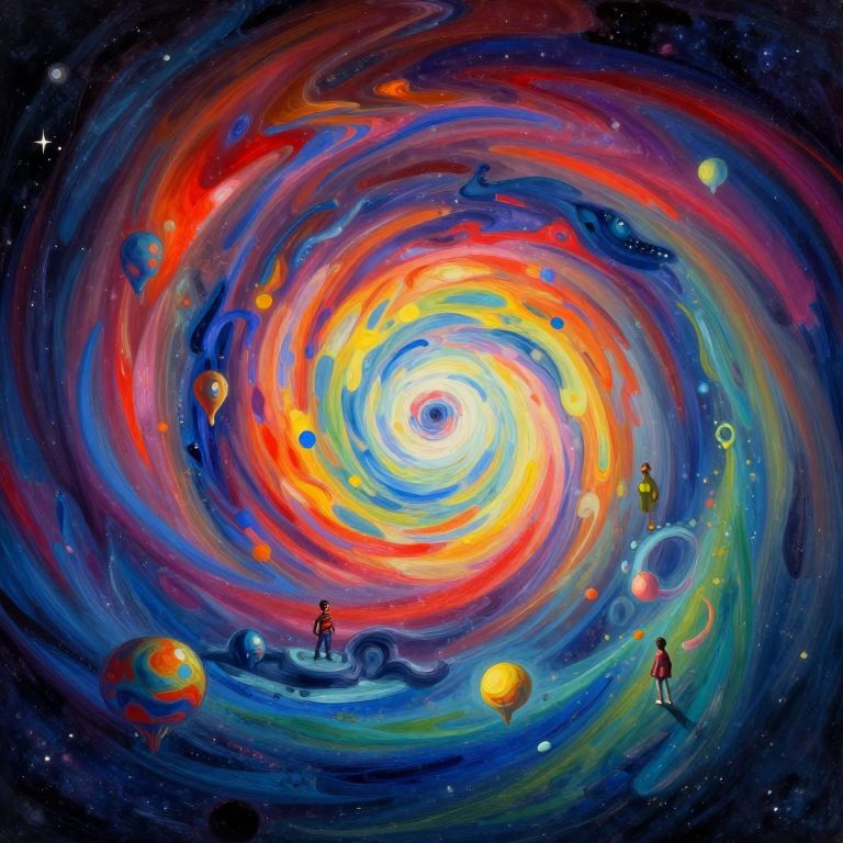 Vibrant, swirling space painting with colorful galaxy center, small figures, planets, and stars. Bright reds, blues, and yellows dominate