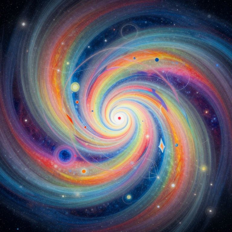 A captivating digital artwork depicting an entrancing cosmic vortex, reminiscent of Kandinsky's Composition VII. The swirling mass of vivid hues draws the eye from an elevated viewpoint, where one can see themselves as minuscule figures amidst floating alien landscapes within this kaleidoscopic universe. As viewers traverse the gradient, they experience a spectrum of emotions ranging from awe to tranquility and back again, reflecting the harmonious conflict Kandinsky sought to convey through his musical composition that inspired this visual symphony.